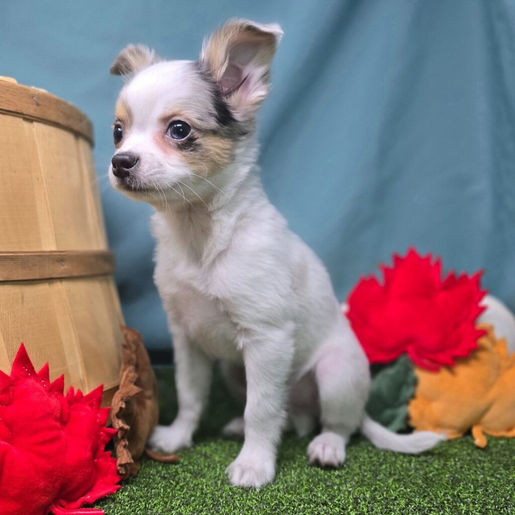 Hi, I’m Skye! I’m a 10-week-old female Chihuahua with a beautiful blue fawn & white coat,once I’m grown enough to leave my litter. When I reach my adult size, I should weigh between 4–5 lbs. I’m APRI registered. Not only am I cute, but I also have a great personality too. Before arriving home, I will be up to date on my vaccinations and be pre-spoiled.