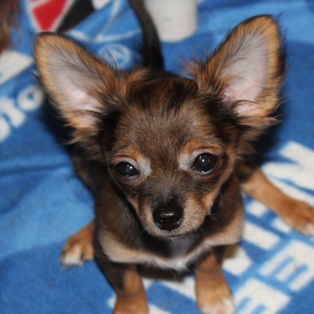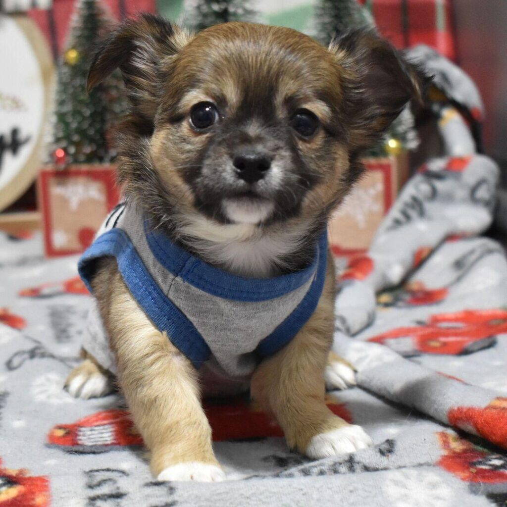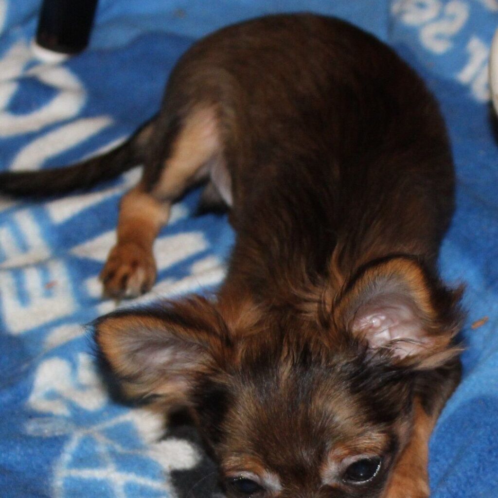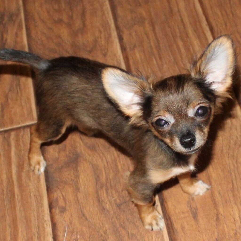 Hi, I’m Cooper! I’m a 9-week-old male Chihuahua with a beautiful chocolate brindled fawn coat,